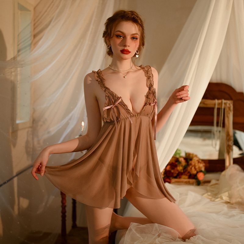 (情趣内衣)羞羞宝贝性感网纱透视睡裙(豆沙)